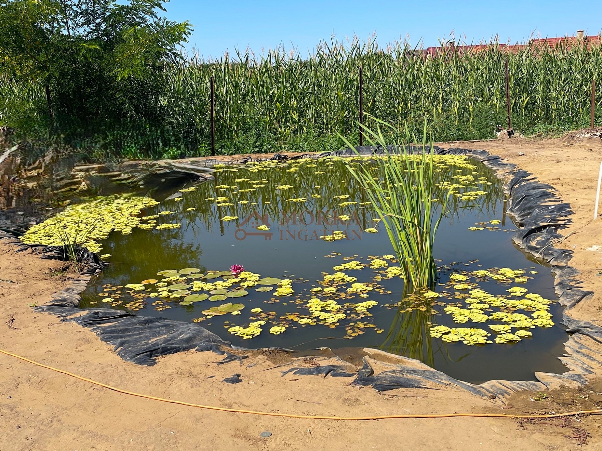 - 2190 nm-es körbekerített telken fekszik. A telek hátsó részében kerti tó lett kialakítva.(fúrt kút van)